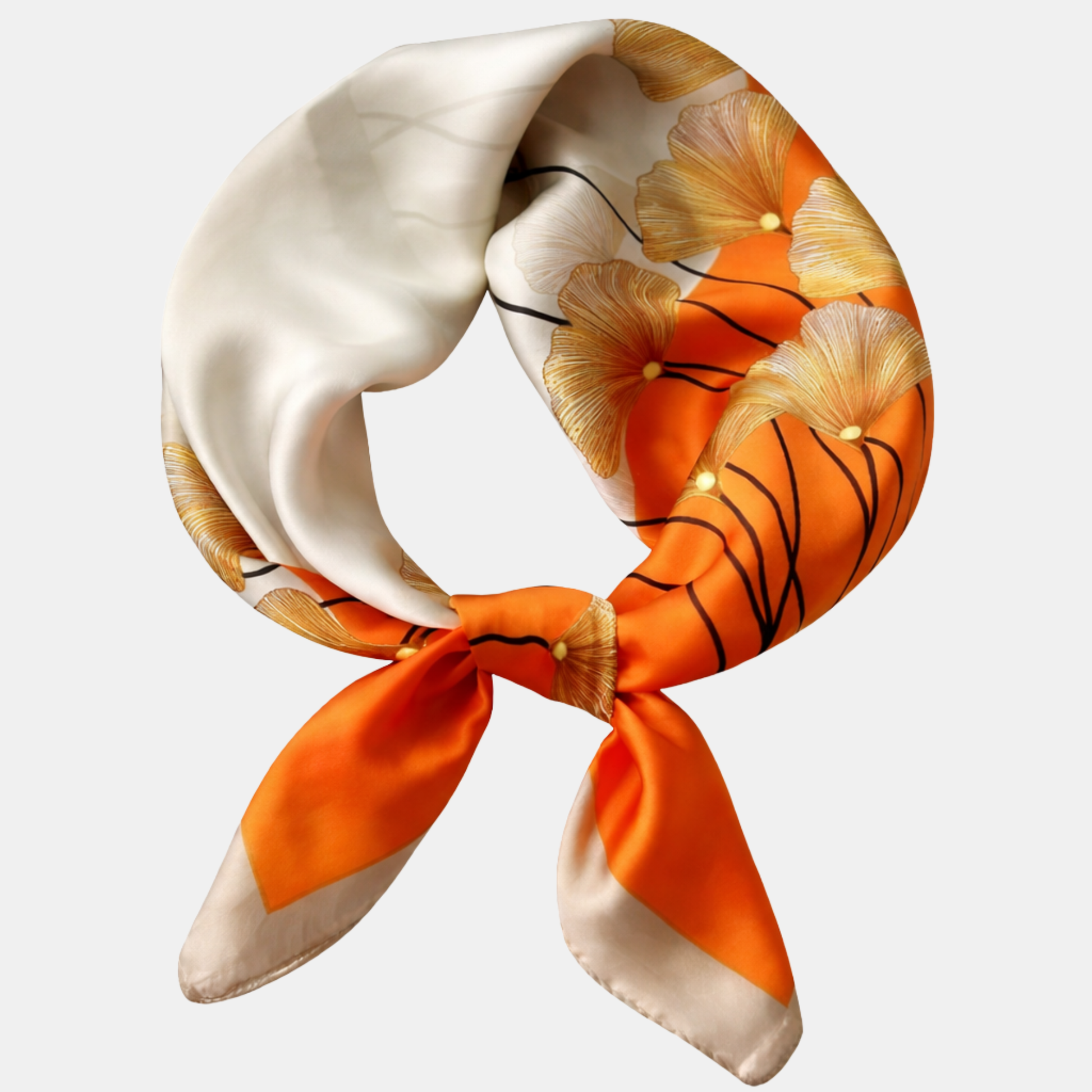 Pañuelo de seda de 66 x 66 cm, con diseño floreado y pasador metálico. Perfecto para llevar como bandana, anudado al cuello para darle un toque de color a un look básico o como detalle en el asa de tu cartera preferida.